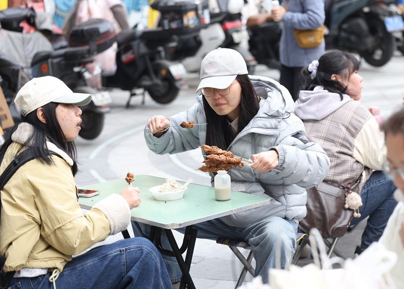 游客在市集上品尝肉串。新京报记者王贵彬摄