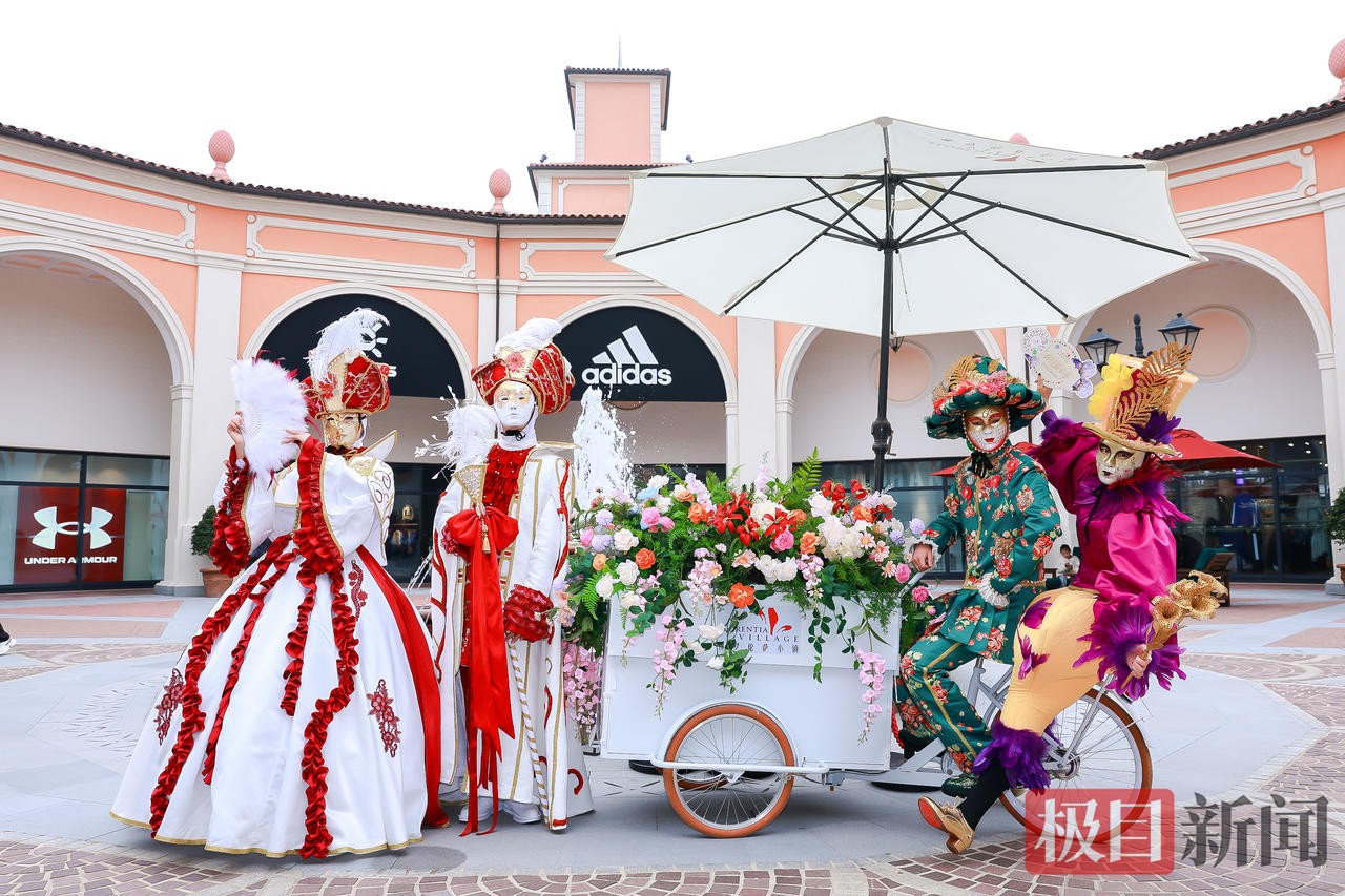 极目新闻记者在现场看到,小镇中心广场上布置了繁花瀑布、花车等景观。身着华服的演员戴着面具巡游,不时与游客互动,再现意式狂欢节的氛围。市民穿行其间,既能感受到意式建筑的独特韵味,也能欣赏到精心打造的春日景致。