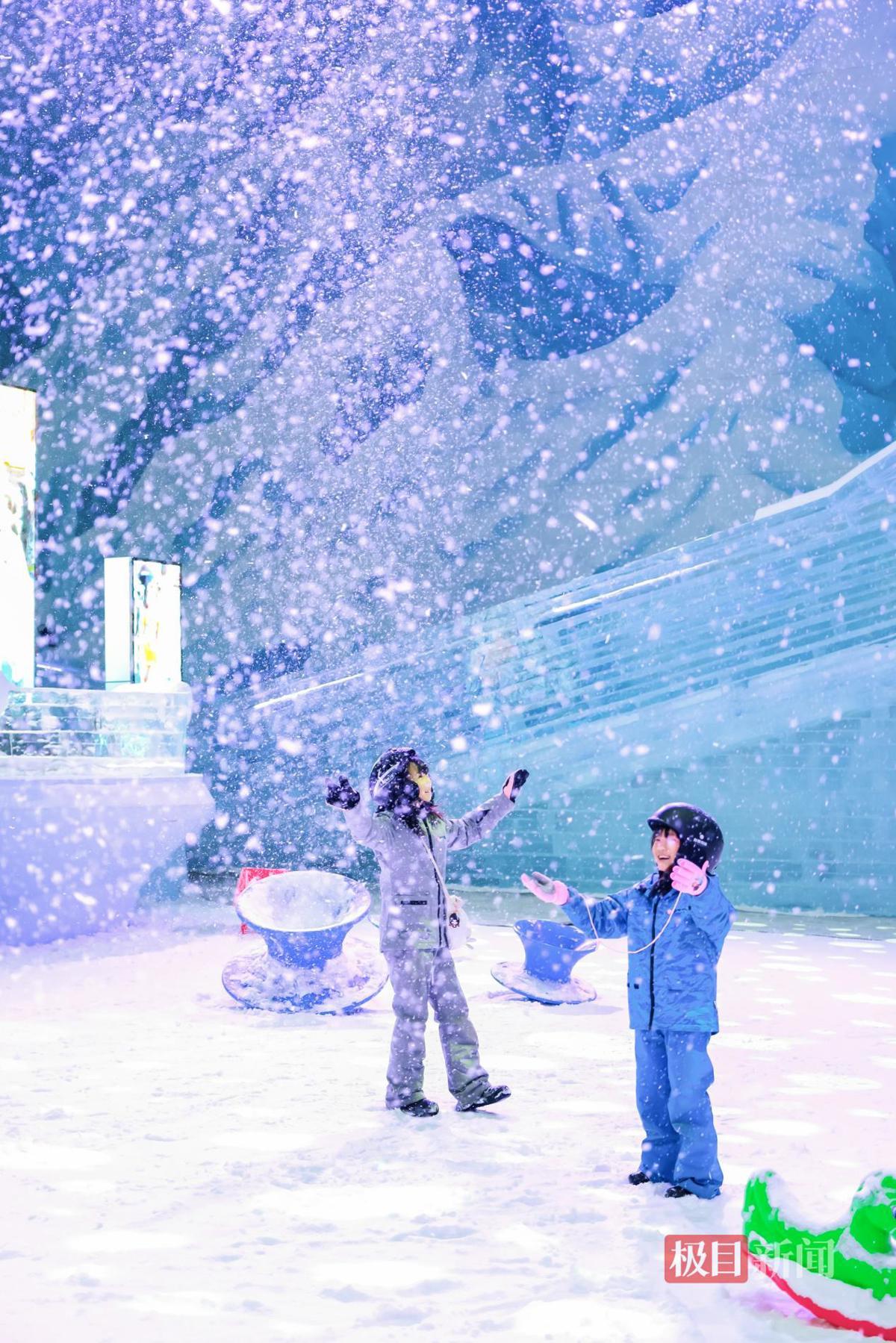 现场最热闹的是雪泡泡泼雪派对,泡泡和雪花混在一起,大人小孩都玩得开。华中首条百米冰上过山车也人气很高,俯冲时的尖叫声隔老远就能听见。雪场定时人工造雪,配上暖色灯光和音乐,营造出“春日飘雪”的意境,不少人站在那里拍照。