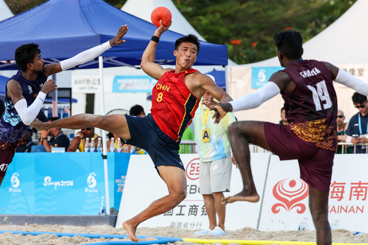 4月21日,在海南三亚举行的第六届亚洲沙滩运动会沙滩手球男子小组赛中,中国队2比0战胜斯里兰卡队。图为中国队球员马会锋(中)在比赛中进攻。(第六届亚洲沙滩运动会组委会 供图)