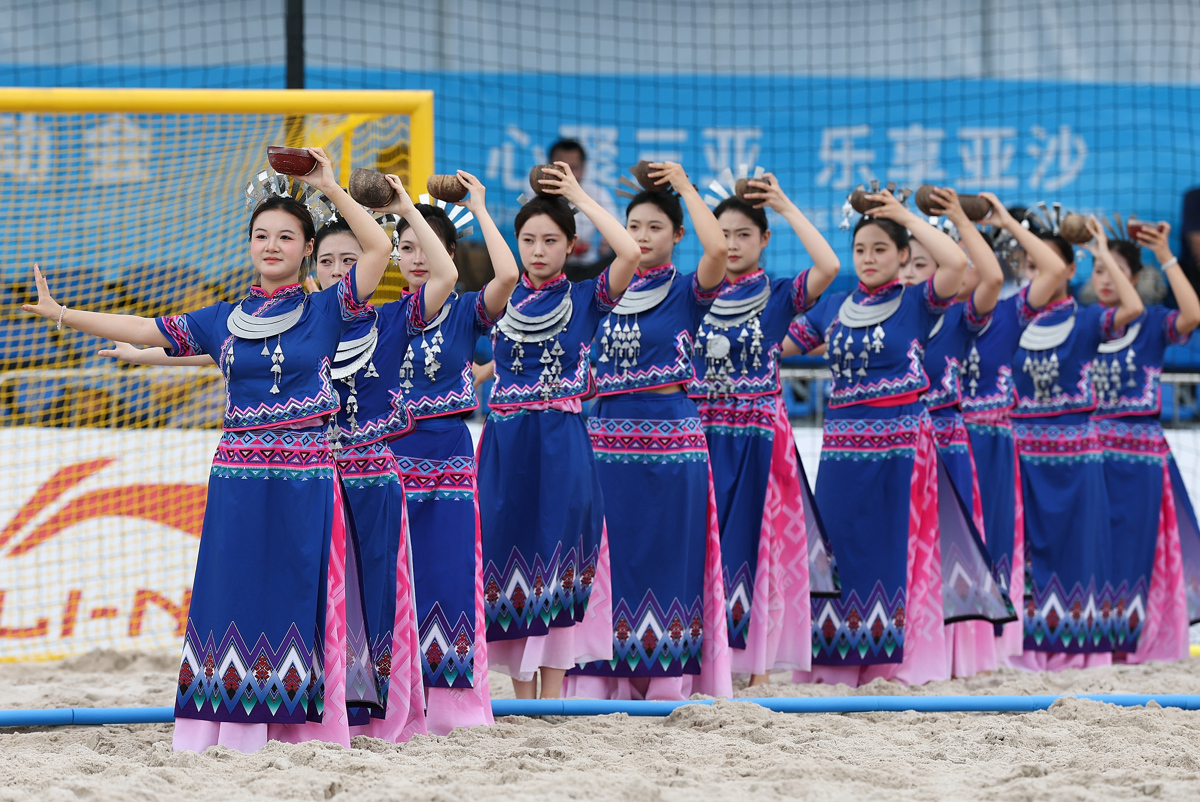 4月21日,第六届亚洲沙滩运动会沙滩手球男子小组赛中,比赛间隙的海南黎族舞蹈表演。(第六届亚洲沙滩运动会组委会 供图)