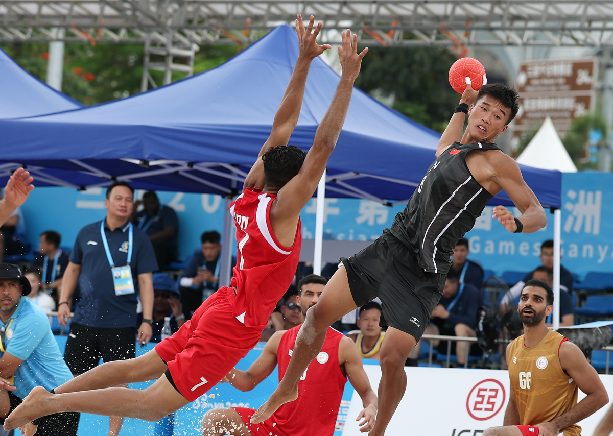 4月21日,在海南三亚举行的第六届亚洲沙滩运动会沙滩手球男子小组赛中,中国队0比2不敌巴林队。图为中国队球员马会锋(上右)在比赛中射门。(第六届亚洲沙滩运动会组委会 供图)