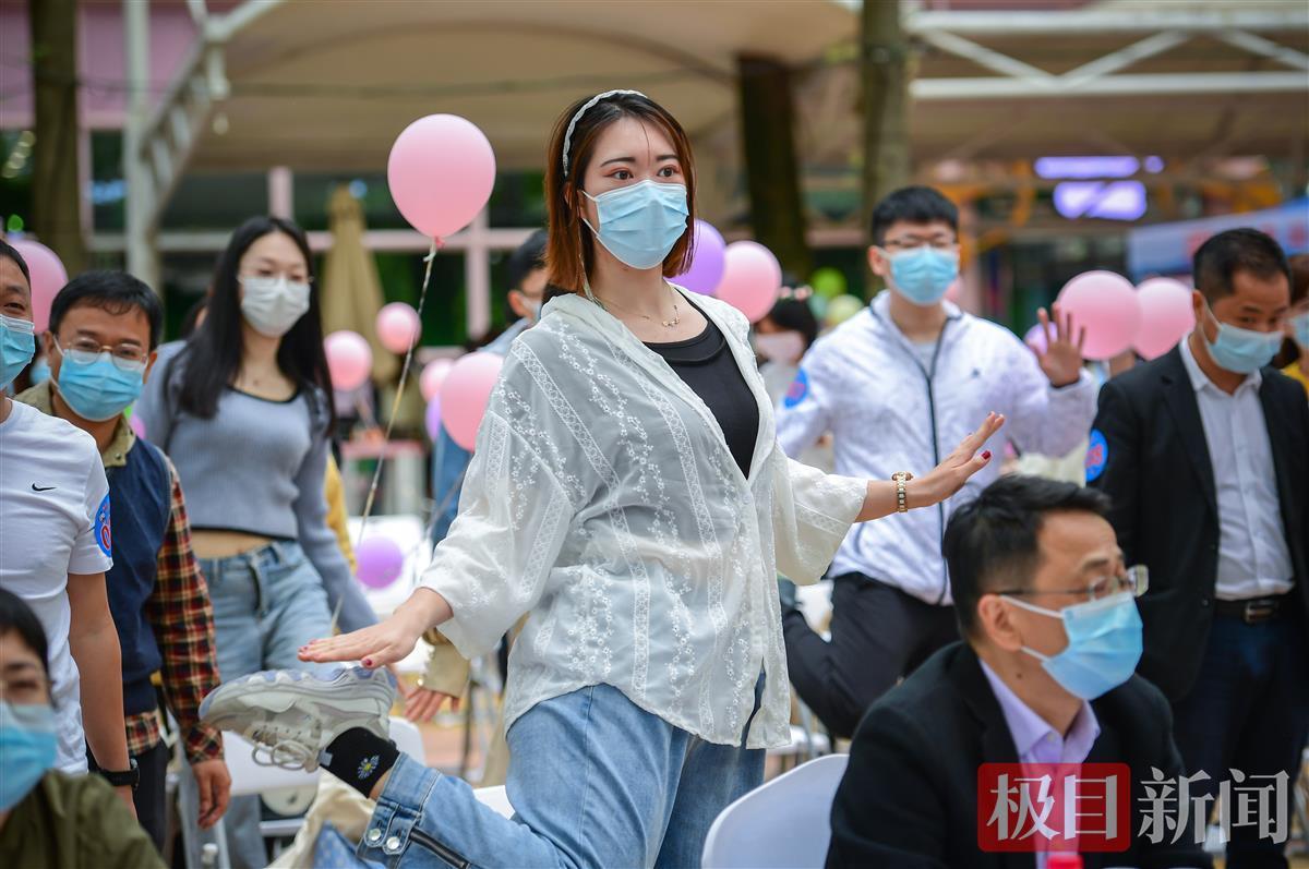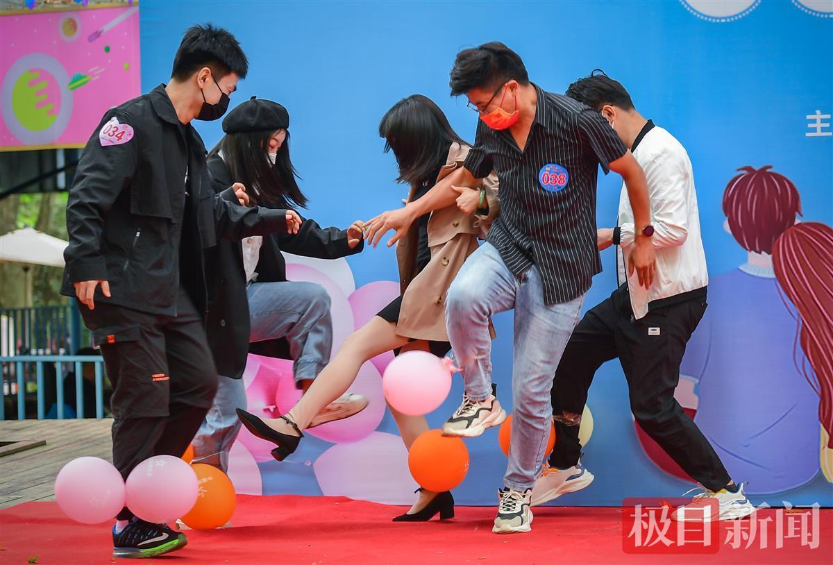 随后的互动游戏环节,传声筒、踩气球……青年男女踊跃参与,现场气氛活泼又热烈。游戏获胜的嘉宾,还获得了自我介绍的机会,大家都落落大方地介绍和展示自己,积极追求机会。没有获胜的嘉宾也不甘落后,好几位男嘉宾举手请求上台展演才艺,他们有的表演街舞,有的唱起情歌,都获得台下阵阵掌声,一下台就有女嘉宾主动上前交流。