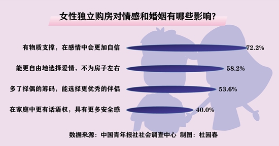 近些年“她经济”崛起,随之引人关注的是单身女性独立购房需求的持续增加。女性独立购房会对情感和婚姻带来什么影响?近日,中国青年报社社会调查中心联合问卷网(wenjuan.com),对2006名受访者进行的一项调查显示,对于女性独立购房对情感的影响,72.2%的受访者认为有了物质支撑,在感情中会更自信,58.2%的受访者觉得能更加自由地选择爱情,不为房子左右。