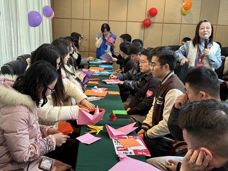在“纸鹤传情话衷肠”游戏现场,男女青年先是同做千纸鹤,在温馨的氛围中逐渐敞开心扉。接下来的“你比划我来猜”默契考验环节,大家在欢声笑语中打破陌生感,增进了解,几轮游戏后,现场氛围迅速升温。