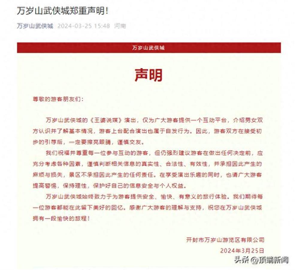 “王婆说媒”爆火,因为前来相亲的人太多。3月25日下午,万岁山武侠城发布《声明》,仅提供互动平台,建议游客在接受初步的引荐后,一定要擦亮眼睛,谨慎交友,景区不承担因此产生的任何责任。