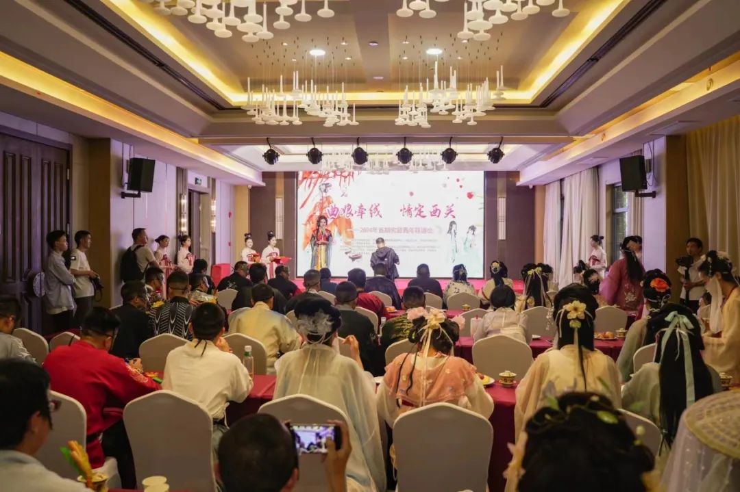 一曲婚俗迎宾舞在周南广场开启相亲活动后,两队提灯仪仗小仙女在西关印象五光十色的夜景里引领参与活动的年轻嘉宾们步入会议室。嘉宾们统一身着汉服、佩戴面具,开始了一场别开生面“一见钟情、不问来处”的自我介绍和相互认知环节。