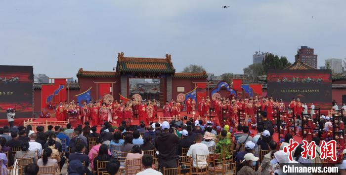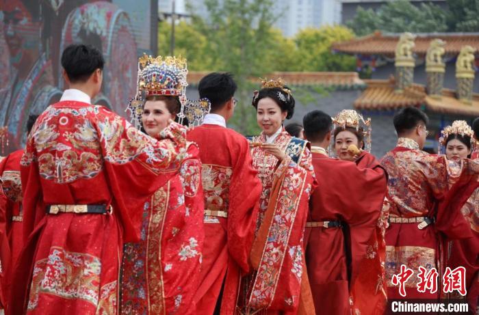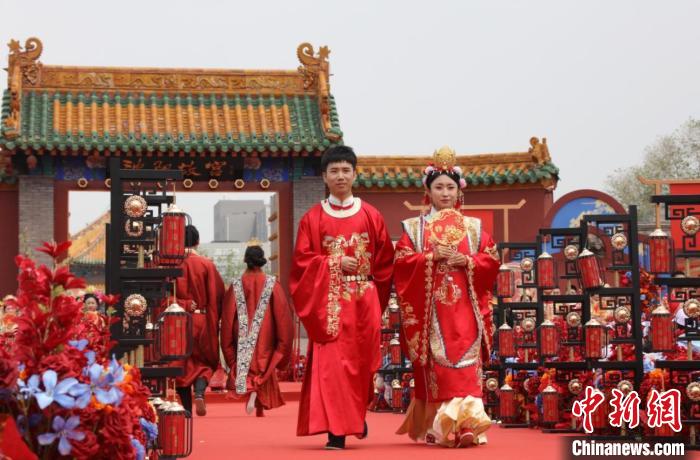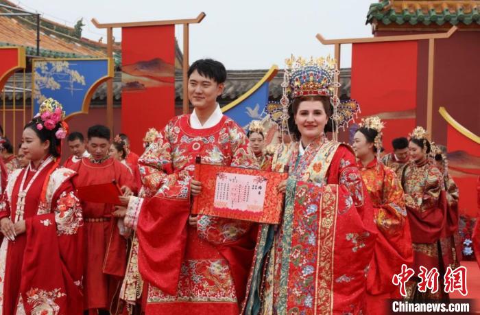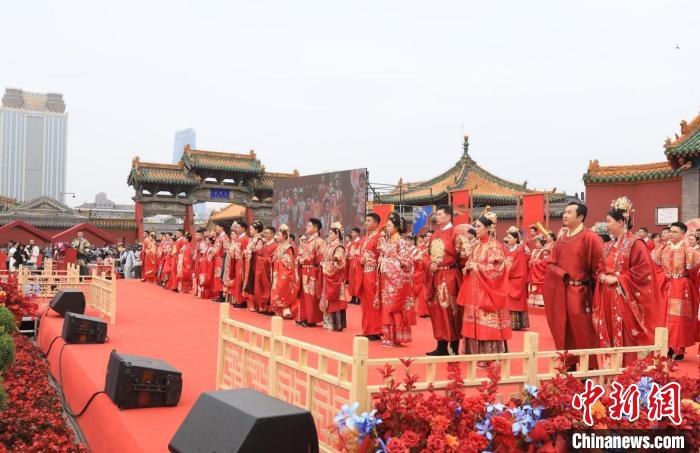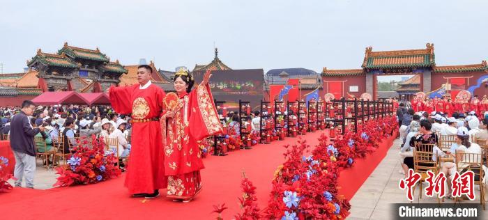中新网沈阳5月22日电(记者 赵桂华)52对身着中式喜服的新人从沈阳故宫朱漆大门内缓缓走出,行三拜大礼、交换信物、饮合卺酒、诵读婚书……5月22日,“大国有囍,情定方城”沈阳市暨沈河区第三届国风集体婚礼,在蓝天白云、红砖金瓦的映衬下如期举行,近400年历史的沈阳故宫见证着他们彼此爱的誓言。