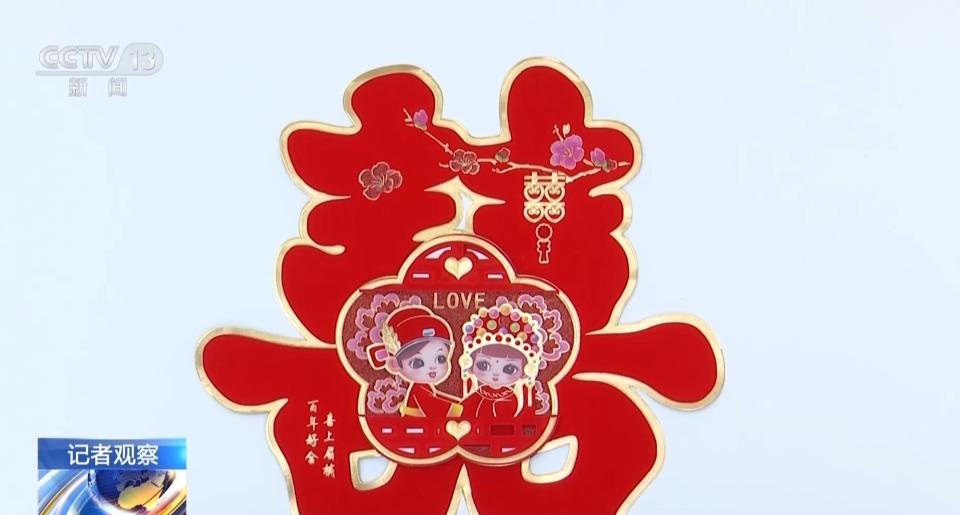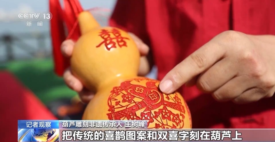 葫芦雕刻非遗传承人 王树峰:把传统的喜鹊图案和双喜字刻在葫芦上,葫芦取谐音“福禄”,有多子多福的寓意,也祝这些新人们喜结连理、福禄万代。