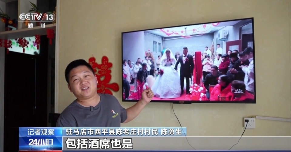 驻马店市西平县陈老庄村村民 陈勇生:这就是我当时结婚的场景,严格按照红娘协会宣传的婚事简办,包括酒席也是,只带15桌亲戚和朋友,每桌也都是两三百块钱的标准。