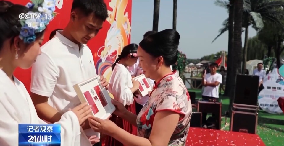 停船靠岸后,由全国最美家庭荣誉获得者作为特邀颁证员为新人颁发结婚证,传递优良家风,还有国家级非遗项目传承人现场雕刻葫芦,为新人送上祝福。