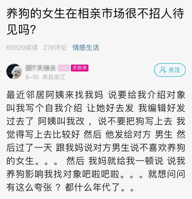 近日,有网友发帖问“养狗的女生在相亲市场很不招人待见吗?”