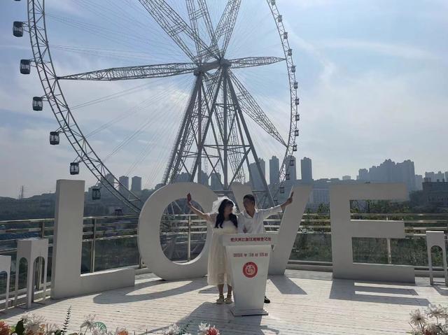 “我们自愿结为夫妻,共同肩负起婚姻赋予我们的责任和义务……”临近中午,两江新区婚姻登记处,一对对满心欢喜的新人手持结婚证,排队在“重庆之眼”摩天轮下合影,许下一生的承诺。
