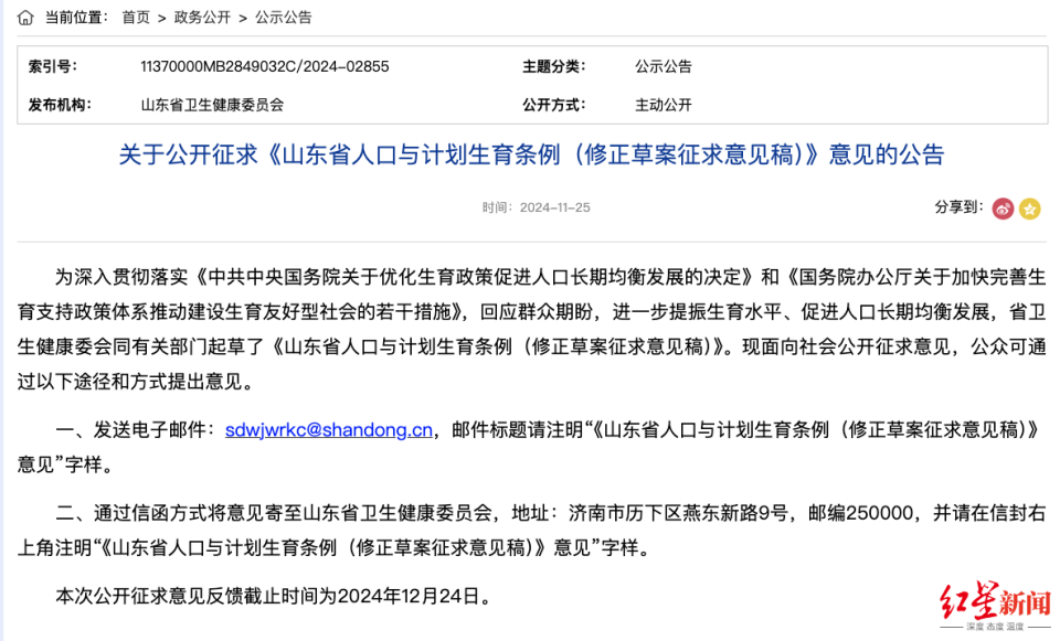 11月25日,《山东省人口与计划生育条例(修正草案征求意见稿)》(简称修正草案)面向社会公开征求意见,截止时间为2024年12月24日。