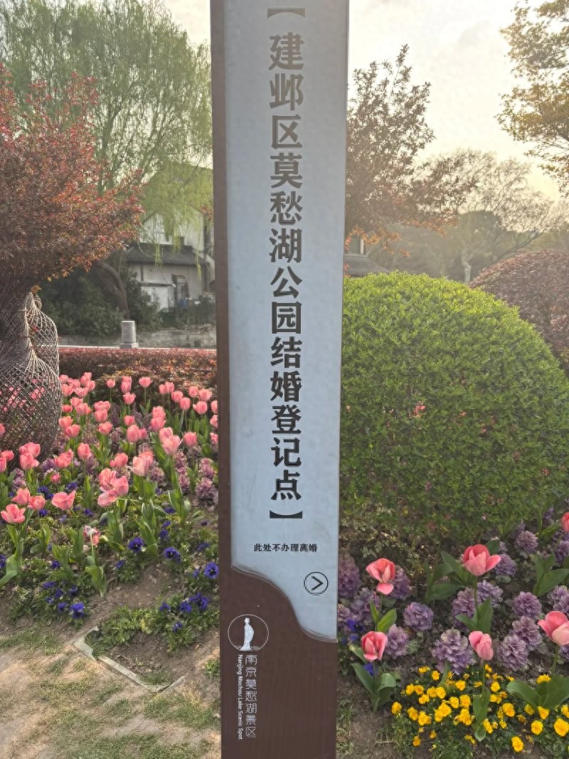 近日,有人在社交平台发帖称,在南京莫愁湖公园里有个登记点“只办结婚不办离婚”。网帖图片显示,一处竖立在花坛旁的标识牌上写有“建邺区莫愁湖公园结婚登记点”,下方标注“此处不办理离婚”。帖文发布后引发关注,不少人表示“在公园里领证挺有仪式感”,也有人提出疑问,“既然能登记结婚,为何不办理离婚”。
