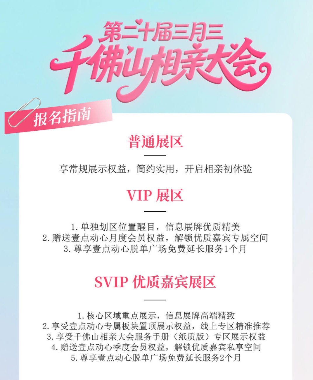 为更好服务广大单身朋友,满足多样化相亲需求,第20届三月三千佛山相亲大会开设普通展区、VIP展区、SVIP优质嘉宾展区三大类型展区,不同展区匹配专属权益。