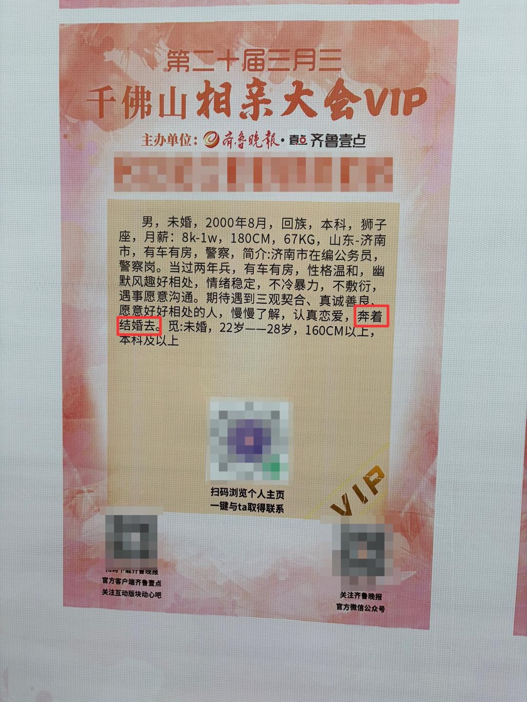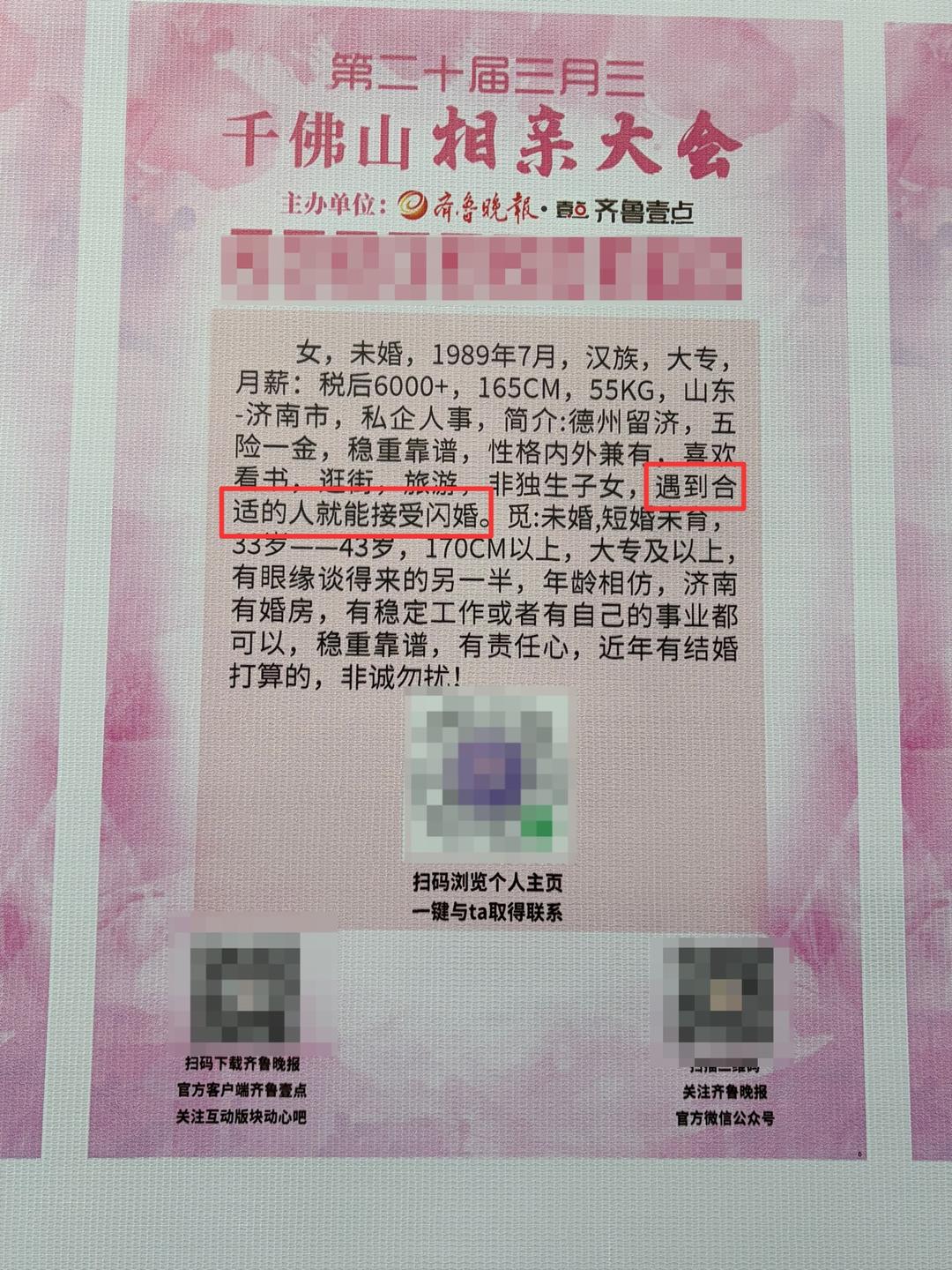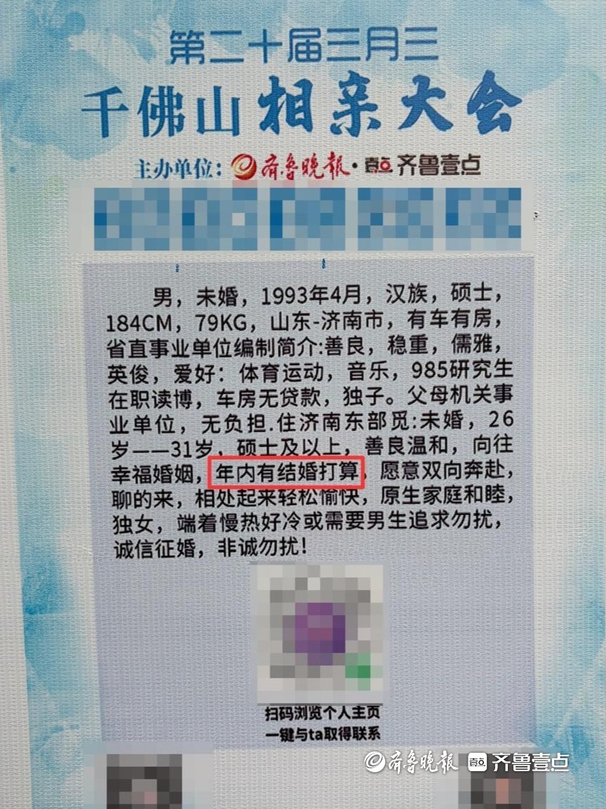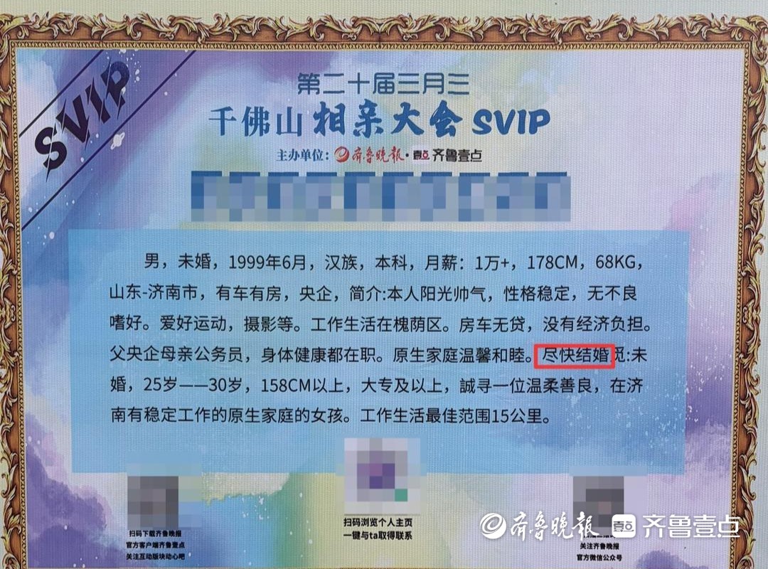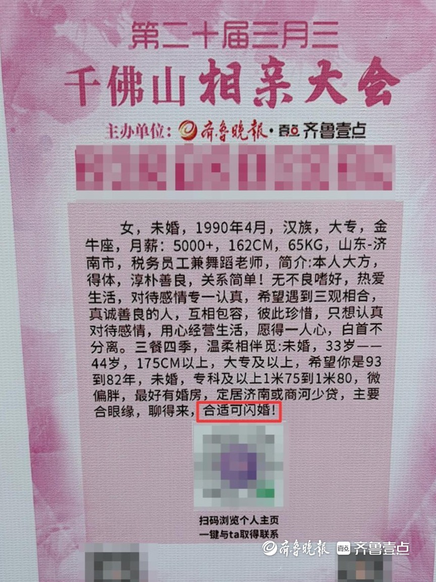 4月18日,由山东数字文化集团指导,齐鲁晚报·齐鲁壹点主办的第20届三月三千佛山相亲大会火热进行中。现场,记者发现不少男女嘉宾在信息牌中透露出对婚姻节奏的不同期待。有的人希望“尽快结婚”,表示“闪婚”也接受;而有的人则期待“慢慢了解,认真恋爱”。