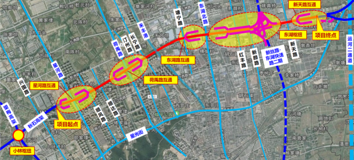 全线设计速度80公里/小时,共设有7对平行匝道、1处综合枢纽,上、下匝道分别为星河路两侧、荷禹路两侧、东湖路两侧各1对,新天路东侧1对,以及与东湖快速路交叉处的东湖互通枢纽。