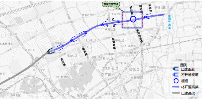 全线共设有7对平行匝道、1处综合枢纽,上、下匝道分别为星河路两侧、荷禹路两侧、东湖路两侧各1对,新天路东侧1对,以及与东湖快速路交叉处的东湖互通枢纽。