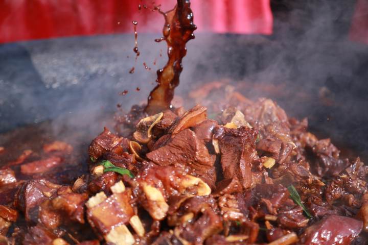 红烧羊肉这道水乡特色菜,要用吃水草长大的本地湖羊来烧,在大铁锅里慢慢炖,30多斤羊肉,要一斤多料酒和各香料下去,还要不停地撇沫子,花上半天功夫,才能炖出一锅好肉。