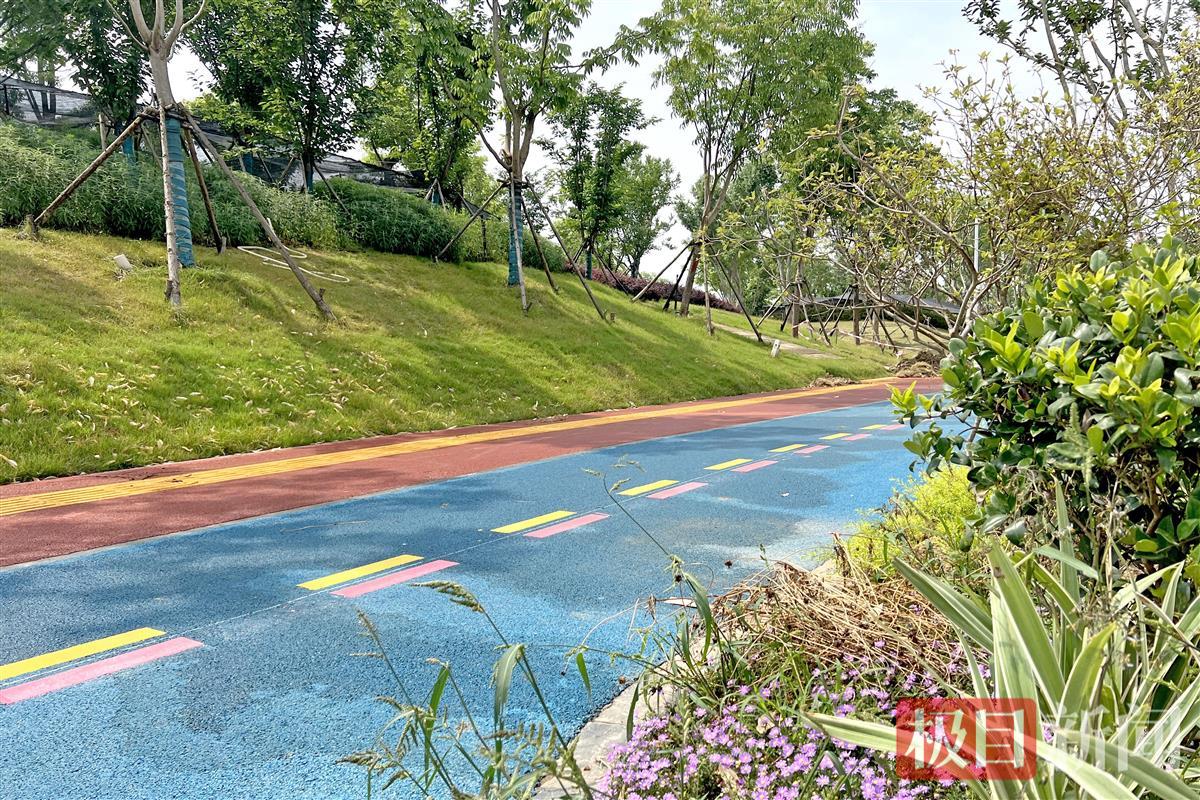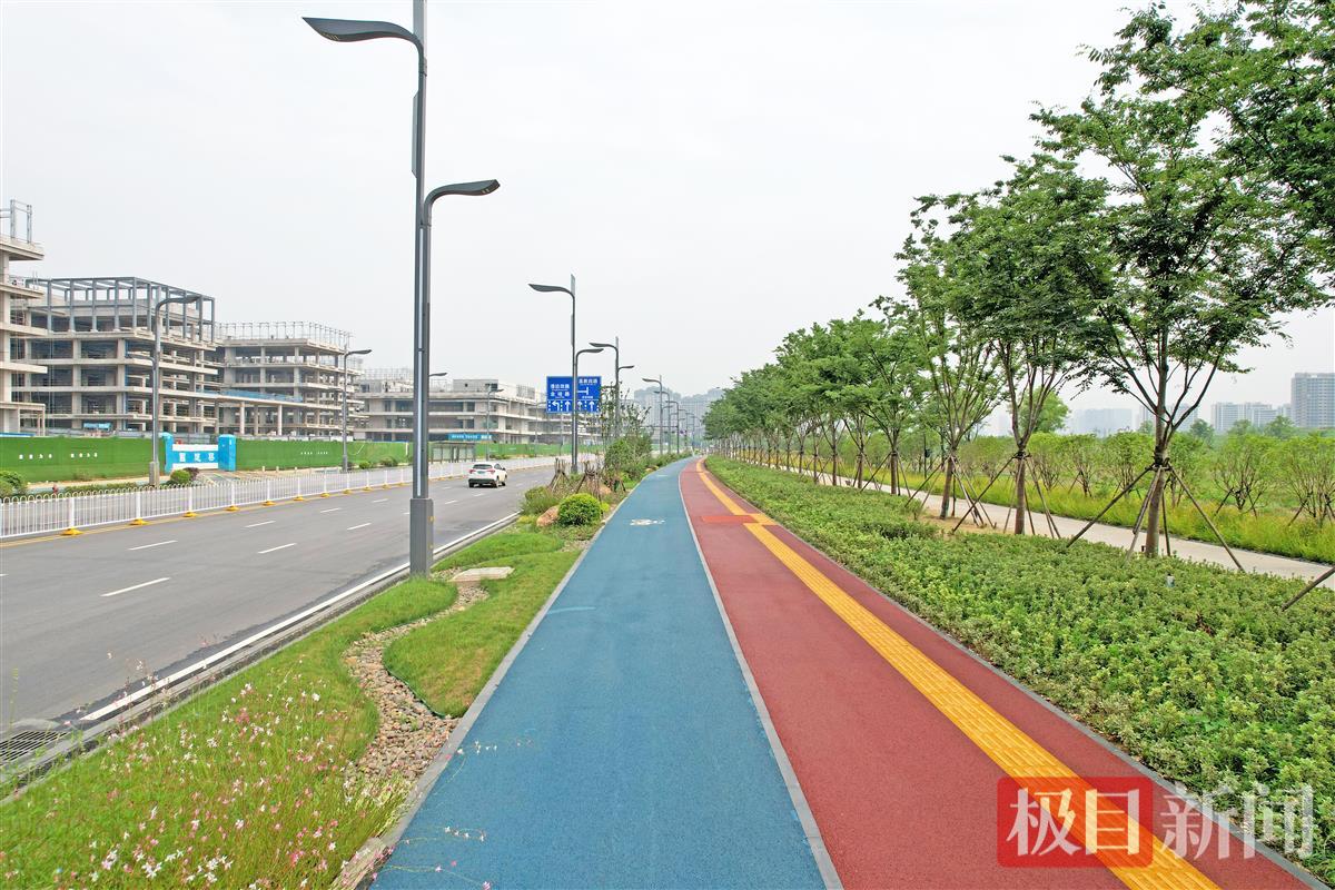 6月5日,极目新闻记者在光谷四路与流芳园路交会处看见,提档升级后的光谷四路不仅道路更宽,人行道、非机动车道更是像画上了美丽的“彩妆”:人行道采用“中国红”彩色沥青铺装,黄色的盲道镶嵌其中;非机动车道采用“光谷蓝”彩色沥青铺装,中间柠檬黄和樱花粉的标志线如同跳动的音符。