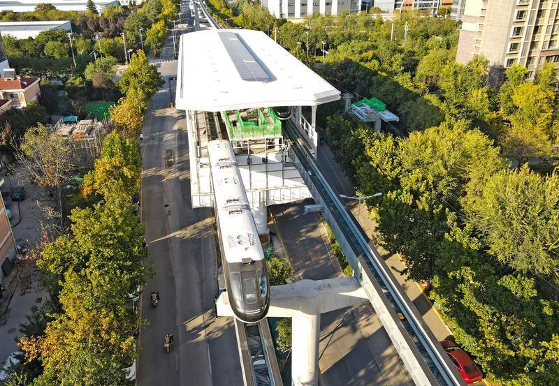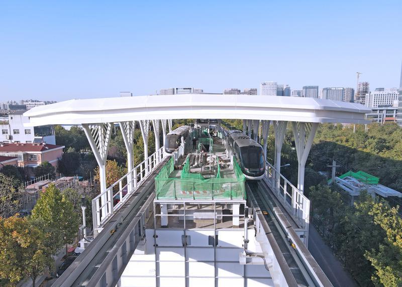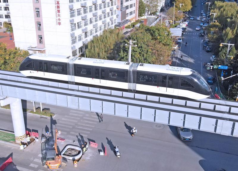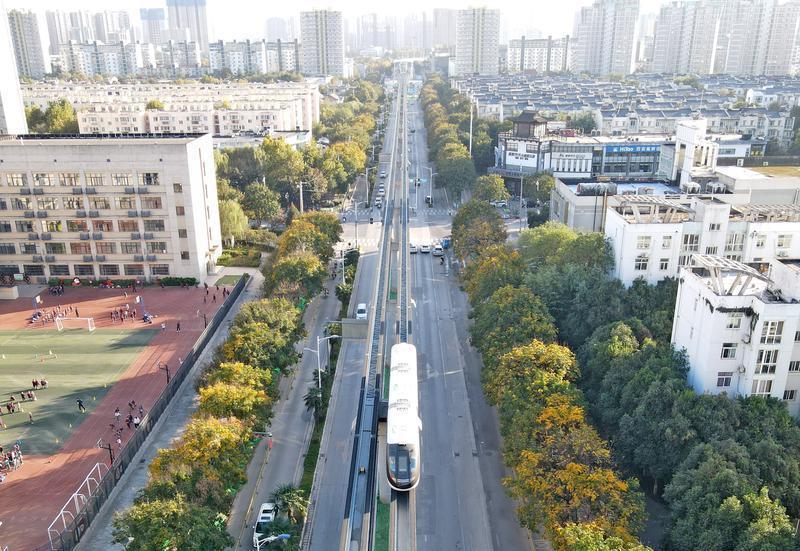 11月6日下午,在丈八四路的西安高新有轨电车试验线轨道上,白色的有轨电车正在试车。记者看到,电车呈“子弹头”外形,三节车厢,由于采用高架轨道,对地面交通没有影响。