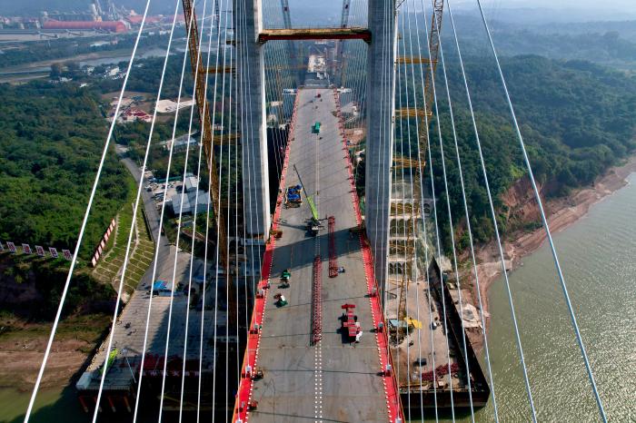 斜拉和悬索组合,强强联合,牢固度加倍。大桥采用的这种构建形态,有效减少了江中桥墩对航运的影响。中铁大桥局项目部党工委副书记张驰对中新网记者介绍,这种设计的优点是跨度大、刚性强、成本低,未来将被广泛采纳和使用。