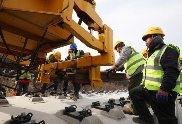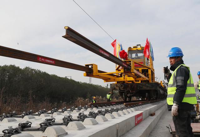 12月26日,在上海市域铁路机场联络线七宝站,操作工人在承轨台上辅助长钢轨铺设就位。新华社记者 方喆 摄