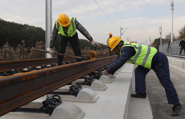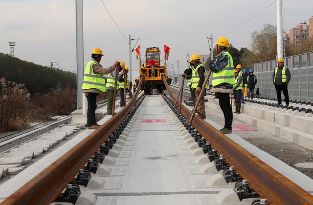 12月26日,在上海市域铁路机场联络线七宝站,操作工人在承轨台上使用抬轨器对钢轨位置进行调整。新华社记者 方喆 摄