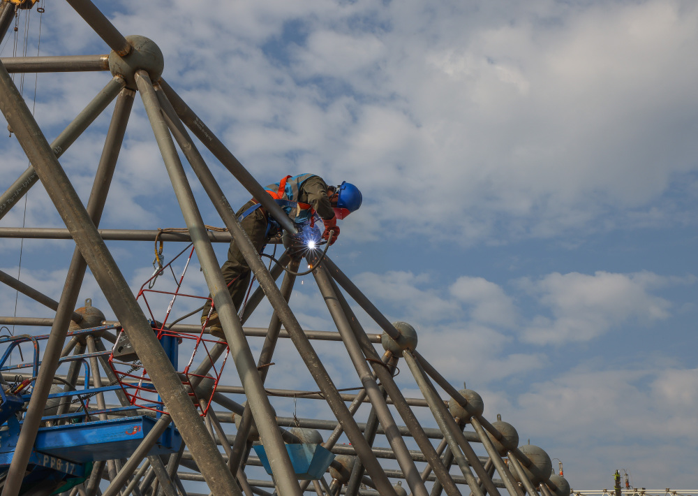 1月5日,建设者在广州白云国际机场T3航站楼进行钢结构网架施工。新华社记者 刘大伟 摄