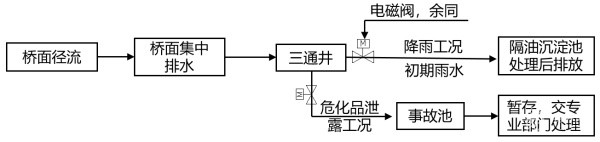 白蚬湖特大桥位于昆山市境内,桥梁全长2769.2米。该项目是将桥面雨水全部通过泄水孔进入在下方新设置的U型玻璃钢雨水渠,将初期雨水收集输送,雨水渠上部不封口,后期径流通过雨水渠上部溢出,在收集范围终点处,由沿桥台向下的管道引至地面检查井。通过电磁阀远程控制,未发生事故时雨水排入隔油沉淀池进行处理后排放;当发生危化品泄漏事故时,事故冲洗水引至事故池暂存,之后再交给专业部门进行无害化处理。