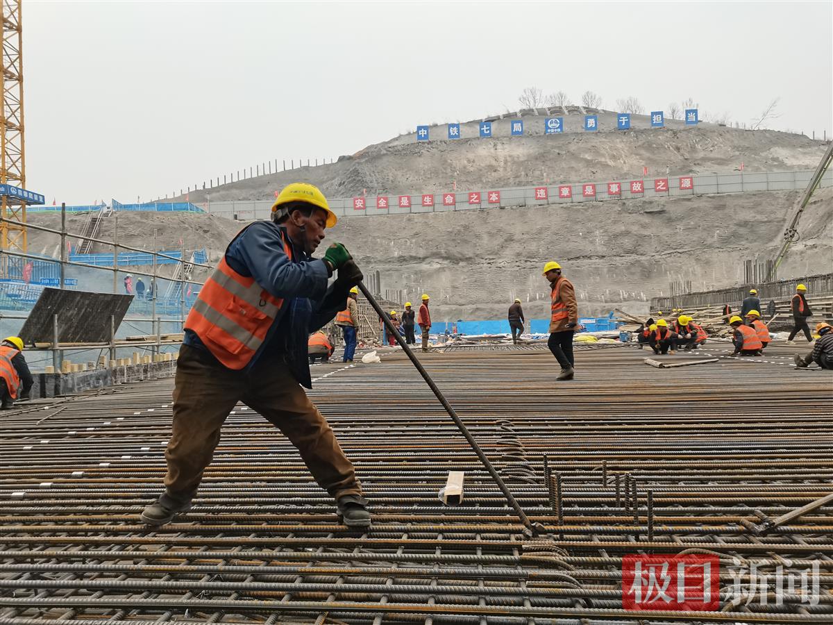 1月30日,极目新闻记者在地下2层的D1区域注意到,现场30余名钢筋工正绑扎钢筋,有的加紧在现场焊接作业。2月1日,轨道交通层顶板浇筑完成。