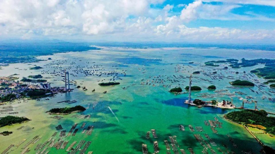 2022年8月27日,平陆运河出海口附近的茅尾海龙门大桥段水域。图/新华