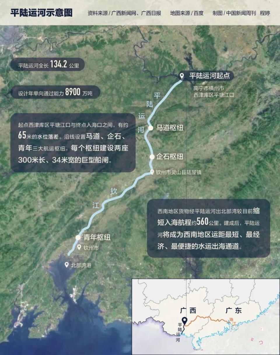 广西壮族自治区交通运输厅党组成员、副厅长胡华平对《中国新闻周刊》说,平陆运河是西部陆海新通道骨干工程,是加快交通强国建设的标志性工程,对推动广西及西南地区发展具有战略意义。