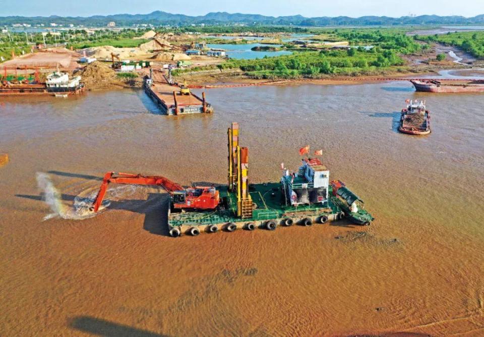 2023年10月3日,施工机械在平陆运河入海口段进行疏浚作业。图/新华
