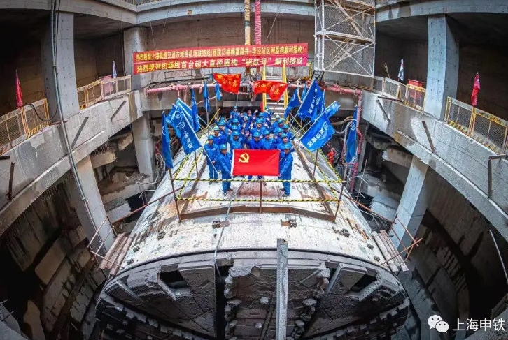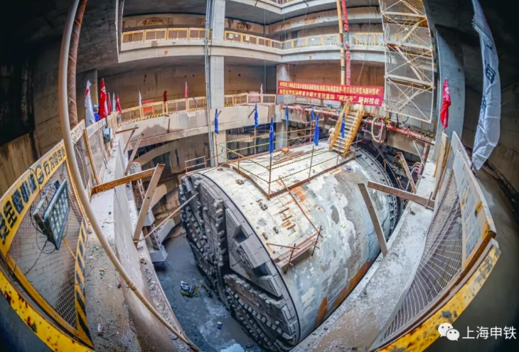 “骐跃号”盾构机于2021年4月18日从梅富路工作井始发,在近10个月的施工中,近距离穿越了220千伏高压铁塔、原水管、虹梅南路高架桥和地面桥、轨道交通15号线等重要建构筑物,单月掘进255环(510米),创下了超大直径“单孔吊装、轨道运输”的国内最快纪录,最终在华泾站顺利完成接收工作。