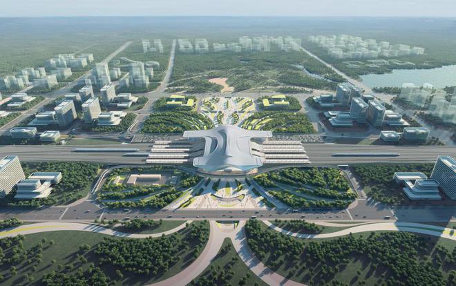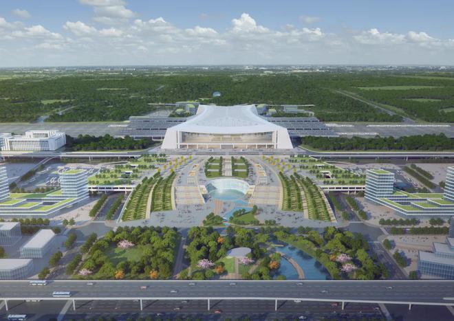 车站采用钢结构加铝镁锰板金属屋面,整体空间造型提炼和吸取了明代传统建筑造型特点,结合传统与现代的设计手法,打造具有“风水宝地,祥瑞所钟”设计理念的地域性地标建筑。目前,站房主体结构已施工完毕,正在进行屋面钢桁架施工。