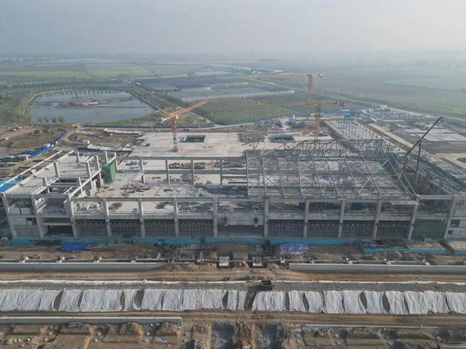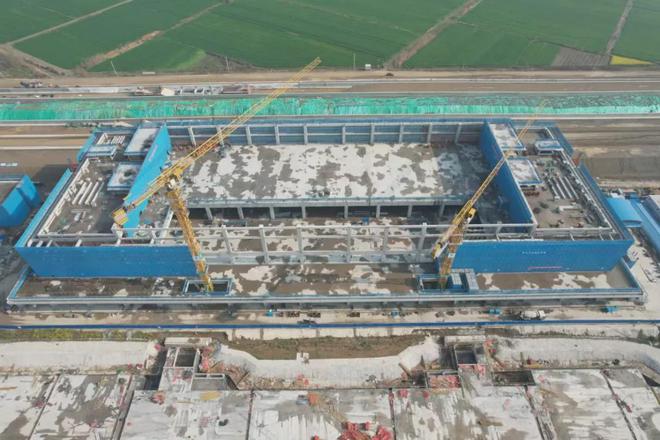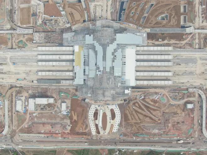 站房以“层波叠浪、水韵汉川”为设计理念,紧扣交通建筑简明大气的风格特征,通过抽象的形式语言,传达“水”文化精髓。目前站房主体结构已完工,正组织屋面钢网架施工。