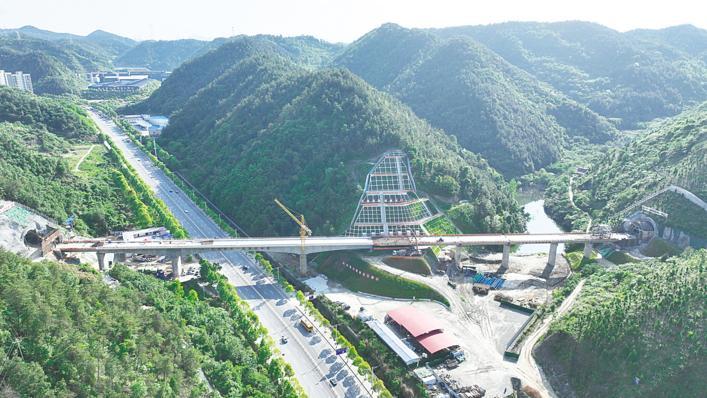二田沟与跨汉江大道大桥跨越十堰大道和山坳,中间是山体高坡,本次合龙的是第6孔24米简支箱梁,梁体与高坡“擦肩而过”。据介绍,该桥原为两座桥设计,中间山体处本为路基设计,为防止地基下沉或山体滑坡,业主方、设计方和施工方优化施工方案,将路基改为桥梁施工,增加了两跨桥梁,铁路上方山体则采用了七级护坡施工。