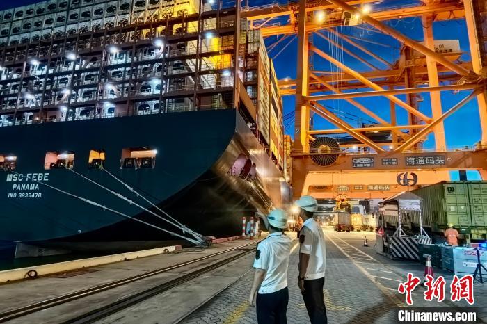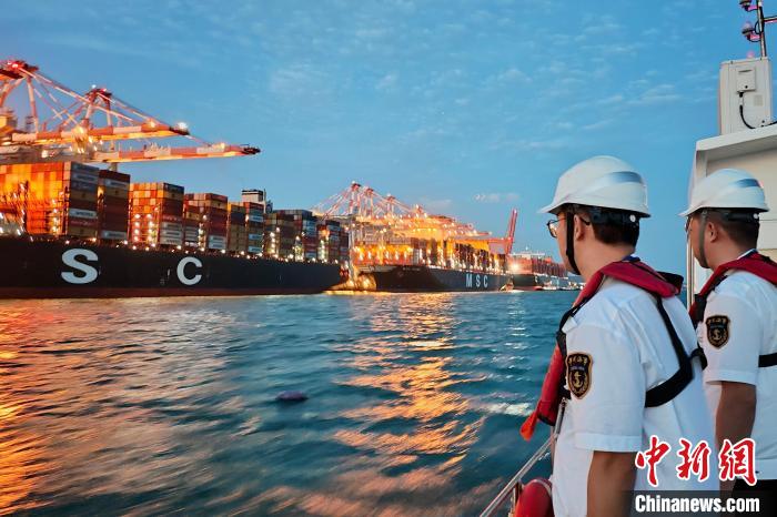厦门海事局工作人员查看靠泊到岸的20万吨级超大型集装箱船舶。 厦门海事供图