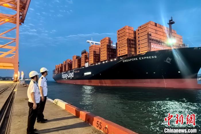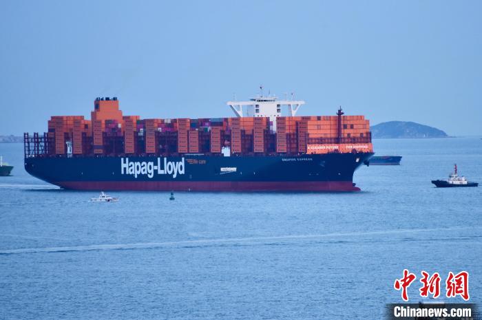 20万吨级超大型集装箱船舶“新加坡快航”轮准备靠泊厦门海沧港区嵩屿集装箱码头。 厦门海事供图