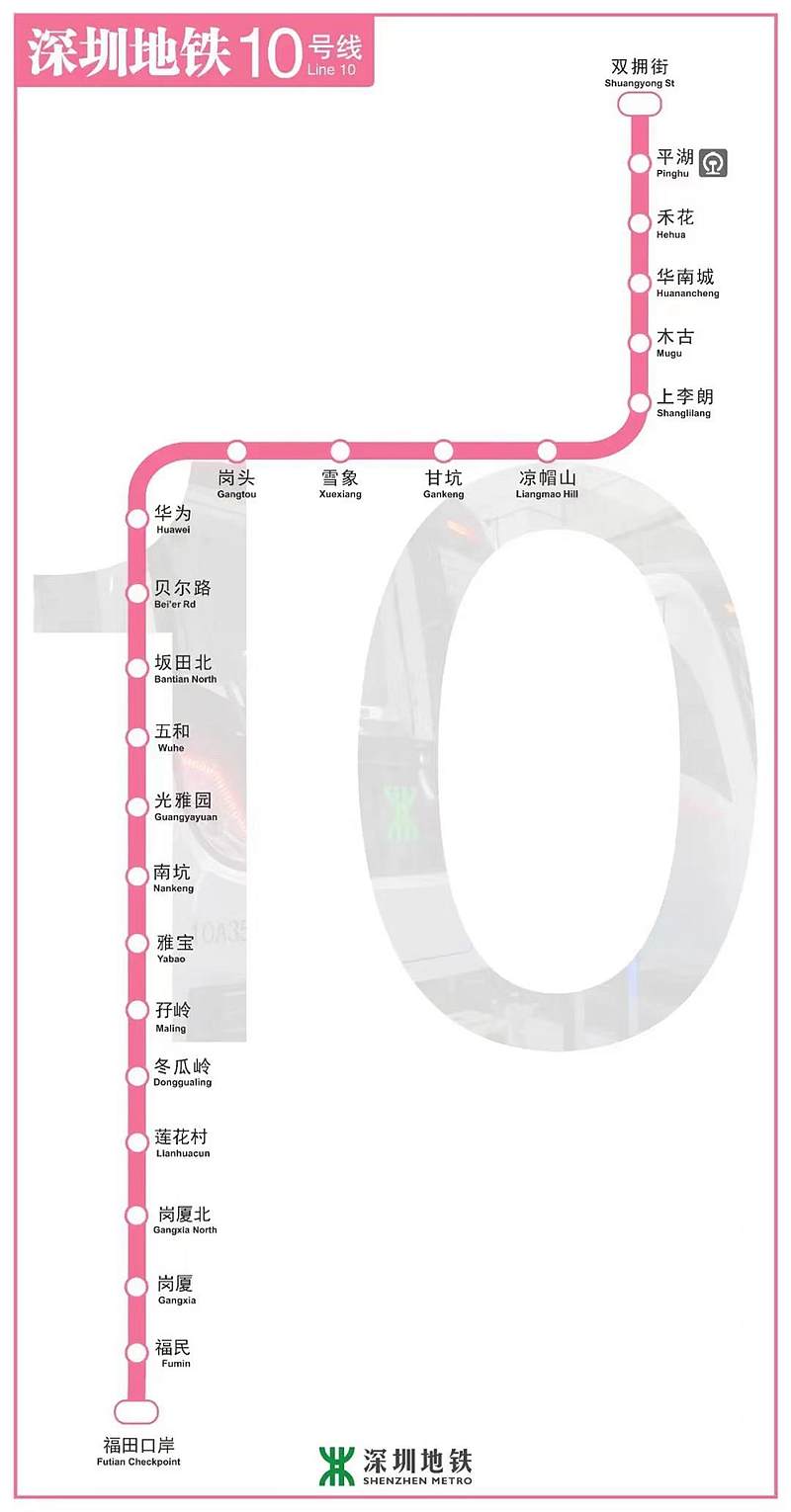 据介绍,深圳地铁10号线是深圳市“东进战略”的重要交通支撑,于2020年8月18日开通运营,全长29.34公里,设车站24个,其中换乘站10个,线路经过福田、龙岗两大区域。深圳地铁10号线的建设通车结束了平湖、坂雪岗、梅林关以东片区不通地铁的状况,同时改善梅林关拥堵问题,方便龙华、坂田、平湖三大区域市民的出行和生活。