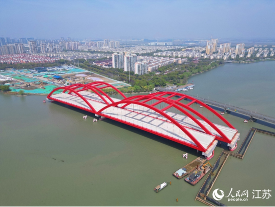 新桥的主桥在前年冬天建成后,其红色拱形造型远远望去犹如一道道彩虹,一度成了网红打卡地。在苏州工业园区胜浦街道金淞湾花园居民丁金业眼里,目前这种情况不是他希望看到的:“总长不到3公里,3年多过去了,至今还是一座‘断头桥’”。