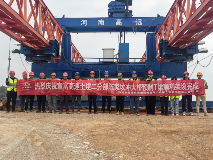 近日,随着最后一片T梁架设,宣威至富源高速公路土建二分部项目陈家坟冲大桥T梁架设顺利完成,这是宣富二分部的首座桥梁,标志着项目建设取得实质性突破。