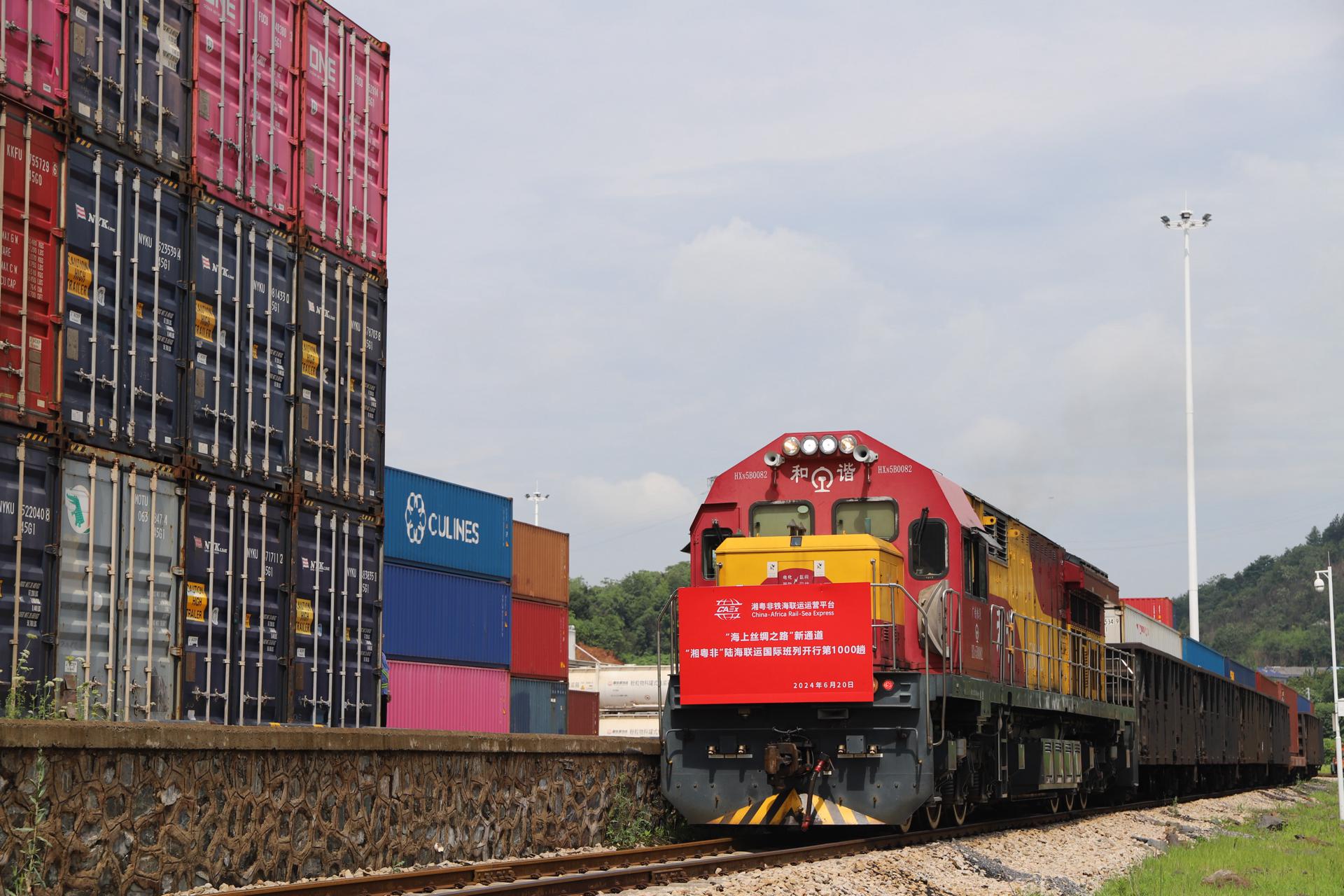 6月20日10时22分,随着一声汽笛长鸣,一趟满载陶瓷制品等货物的“湘粤非”陆海联运国际班列从株洲中车物流园缓缓开出,一路畅行至广州南沙港后,经海运运往非洲。这是自2021年“湘粤非”陆海联运国际班列开行以来的第1000趟。