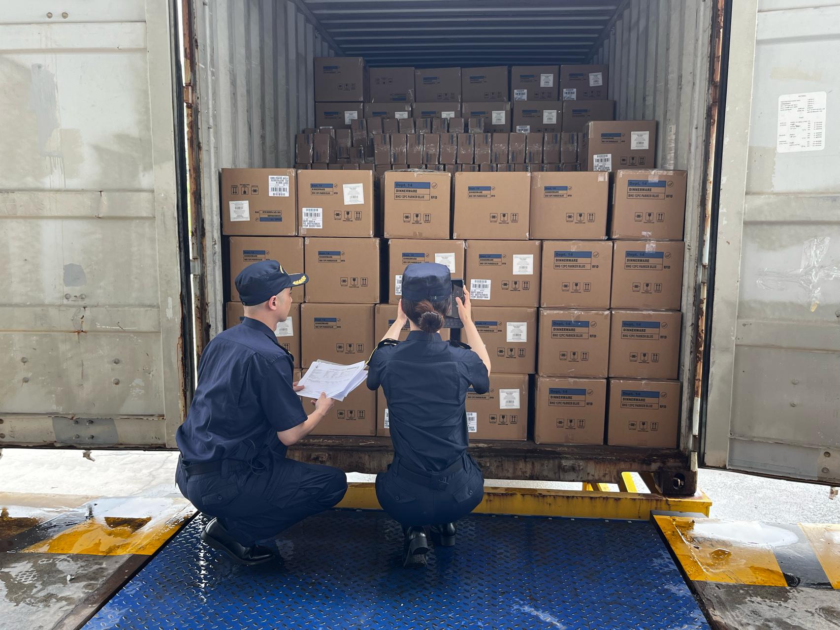 拍照核对集装箱号、打开集装箱、核对装载货物情况……经海关人员查验无异常后,这些货物才能被运送出境。