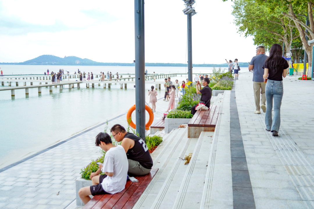 原址修复的栈桥采用了做旧工艺,加固加宽的同时原汁原味复刻了整体结构。记者现场看到,观湖平台面积更大,在临湖边上还布置了多级观湖台阶,让游玩者更好地亲水。