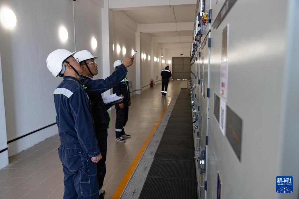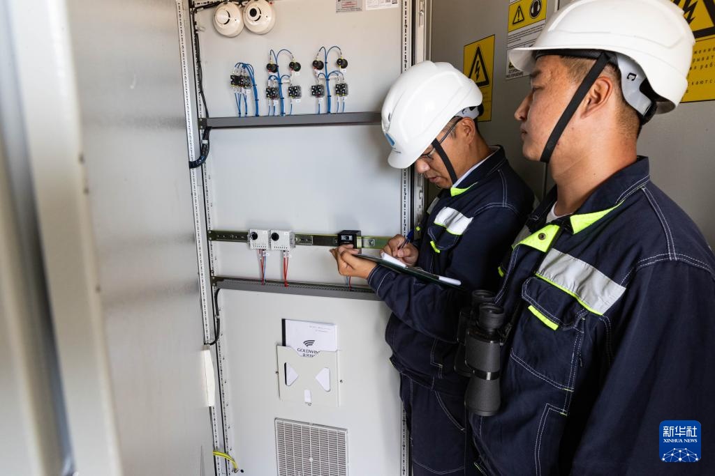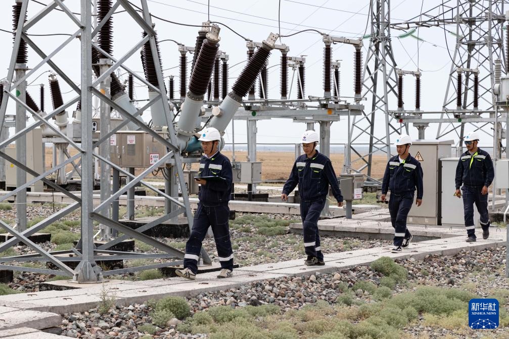 6月25日,在哈萨克斯坦阿拉木图州谢列克风电场,中哈运行人员进行设备巡检。新华社记者白雪骐摄