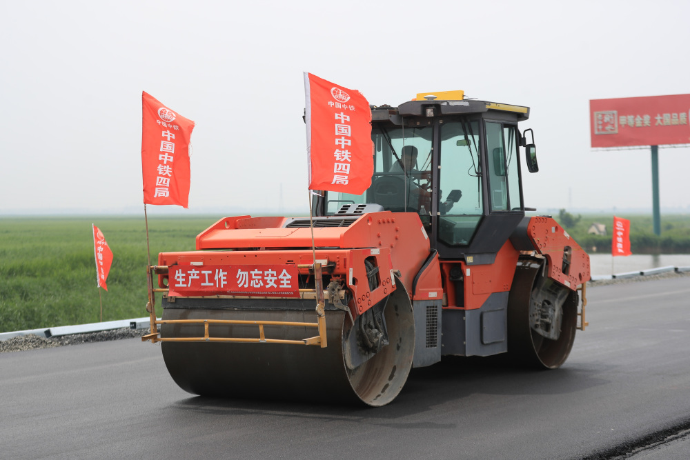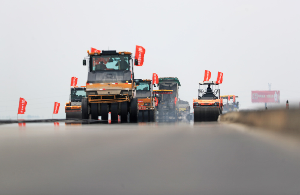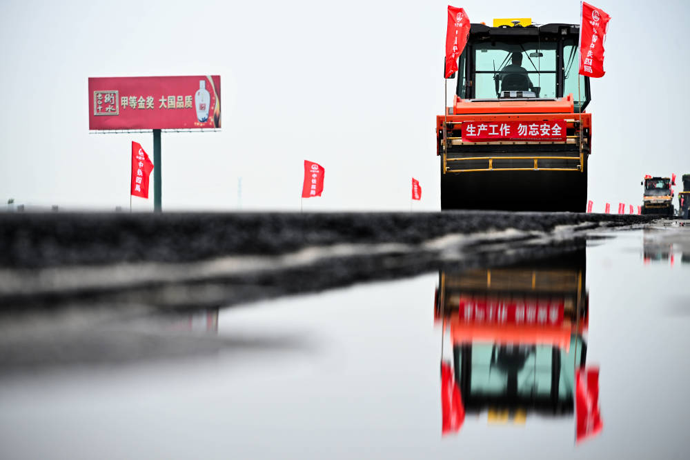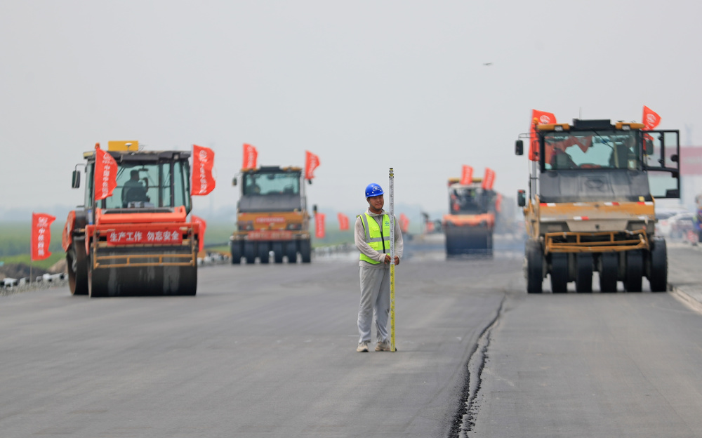 7月4日,在京哈高速公路辽宁段改扩建工程项目施工现场,中铁四局建设者进行路面沥青摊铺作业。新华社记者 杨青 摄