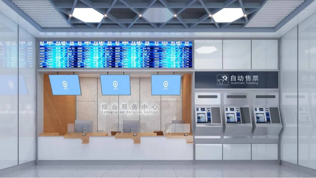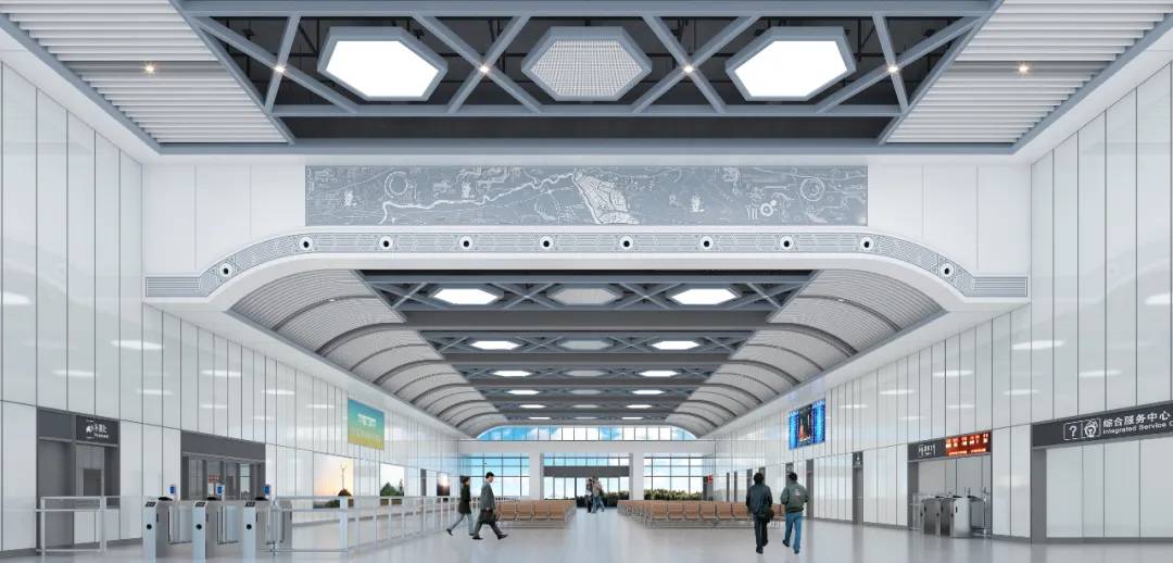 根据工业性、交通性的城市特征,站房整体空间以浅灰色为主色调,蓝灰、黄灰色为点缀色,色彩均进行低饱和度处理,让整个空间色彩更加和谐统一。候车大厅围绕“六”字进行发散联想、抽象提取,以六边形为轮廓,形成基本几何造型元素,运用在候车厅吊顶及墙面装饰中。